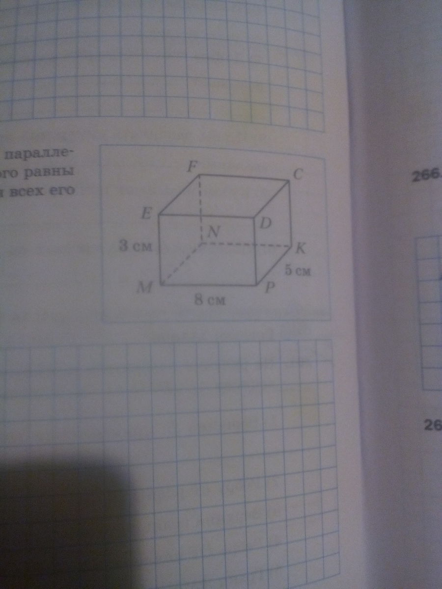 "На рисунке изображён прямоугольный параллелепипед MNKPEFCD измерения которого равны 8 см, 5 см и з см. Вычислите сумму длин всех его рёбер и площадь поверхности"