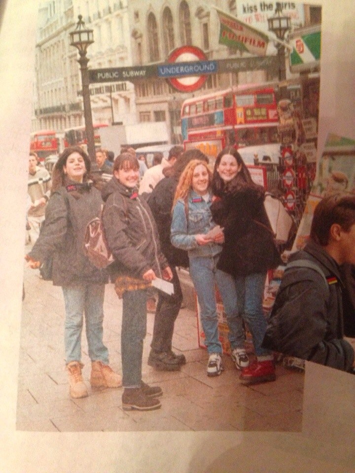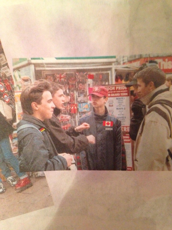 Newapapers are sold; newapapers are bought; boys are asked something; the street is crowded; girls are surprised; photos are taken in the street; the girls are warm dressed