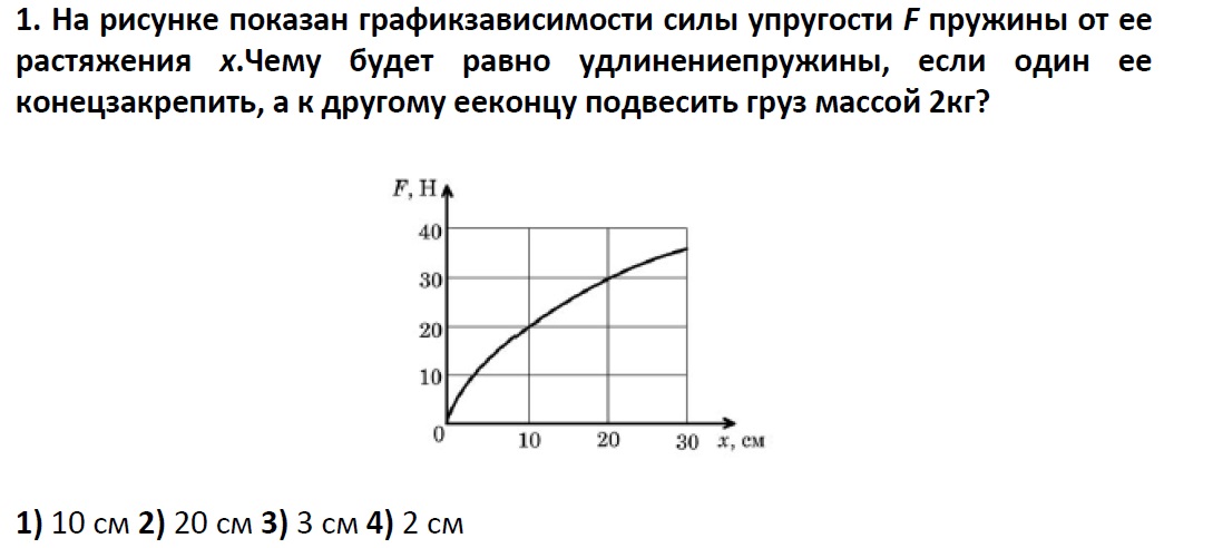 если подвесить груз массой 2 кг,то пружина будет растягиваться под действием силы тяжести Fтяж=Fупр=mg=2*10=20Н. По данному графику зависимости найдем какому удлинению соответствует 20Н.