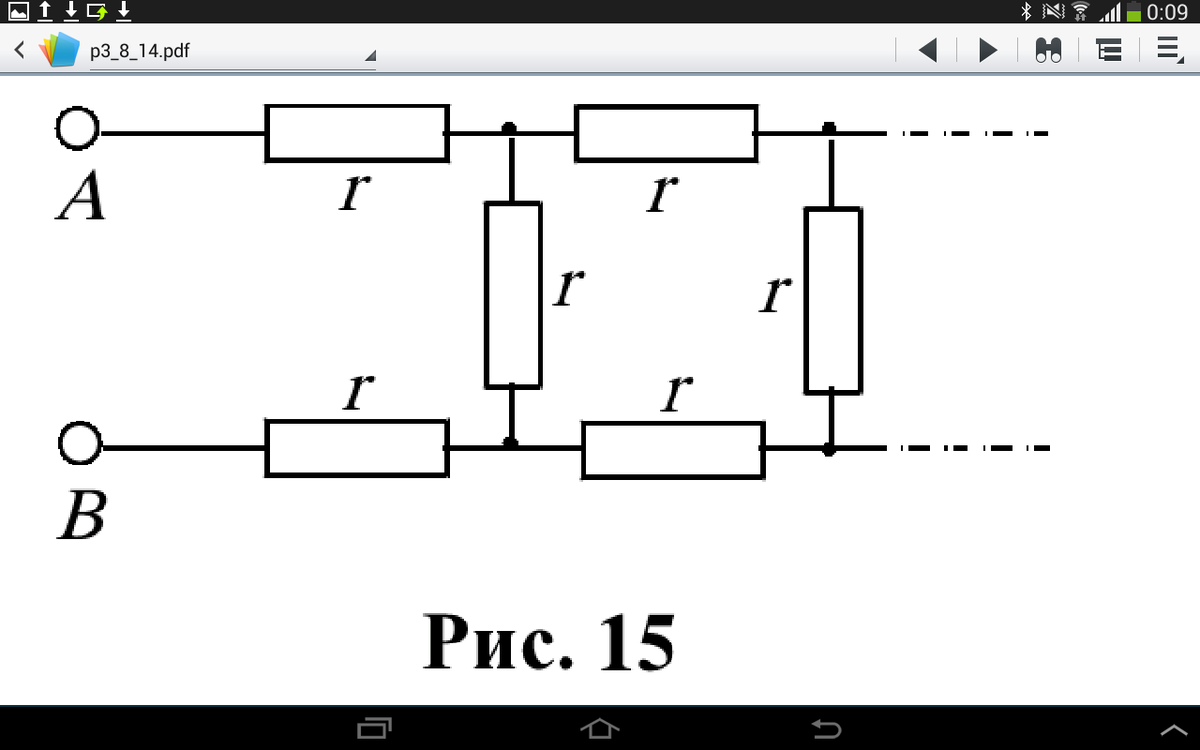 Помогите пожалуйста очень нужно решите задачу :Электрическая цепь состоит из очень большого числа одинаковых звеньев, содержащих три сопротивления r=1Ом (см. рис. 15, на котором таких звеньев два). Определите сопротивление R цепи между точками A и B, если количество звеньев очень велико, т.е. цепочка бесконеч ная. Какое напряжение U следует приложить к цепи, чтобы сила тока в первом сопротивлении ─ перемычке была равна I=1 А?