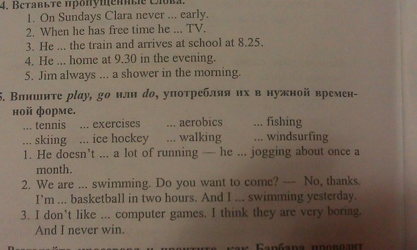 play tennis; do exercices; do aerobics; go fishing; go skiing; play ice hockey; go walking; go windsurfing.