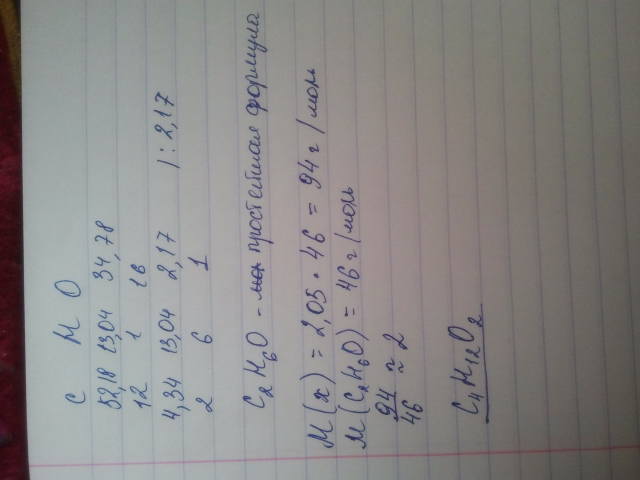 Определить формулу соединения, если массовые доли элементов составляют: С – 52.18%, Н – 13.04%, О – 34.78%, а плотность паров этого соединения – 2.05 г/л