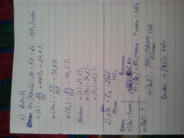 Определите массовые доли элементов в пермангонате калия (KMnO4) Сколько граммов оксида кальция образуется, если в реакцию с кислородом вступили 4 моль металла?