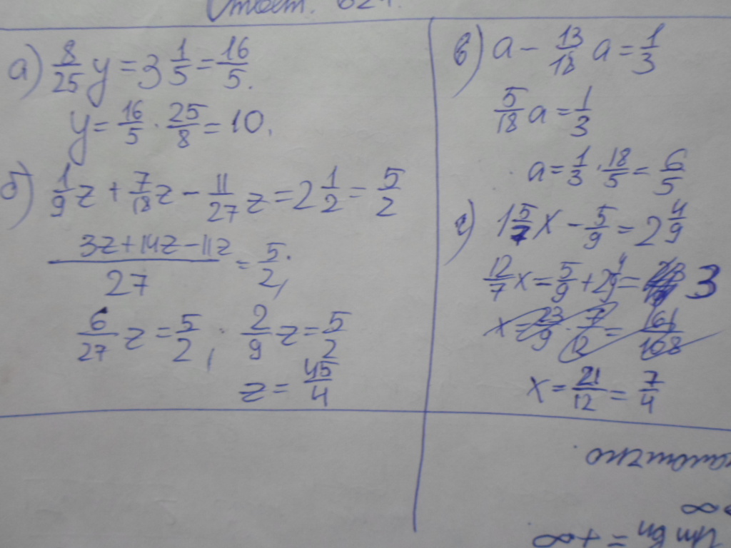 Решите уровнение а) 8/25y=3 цел 1/5 б) 1/9z+7/18z-11/27z=2 цел 1/2 в) а-13/18a=1/3