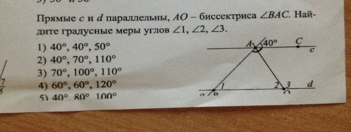 Прямые с и d параллельны, АО - биссектриса угла ВАС. Найдите градусную меру углов 1, 2, 3.