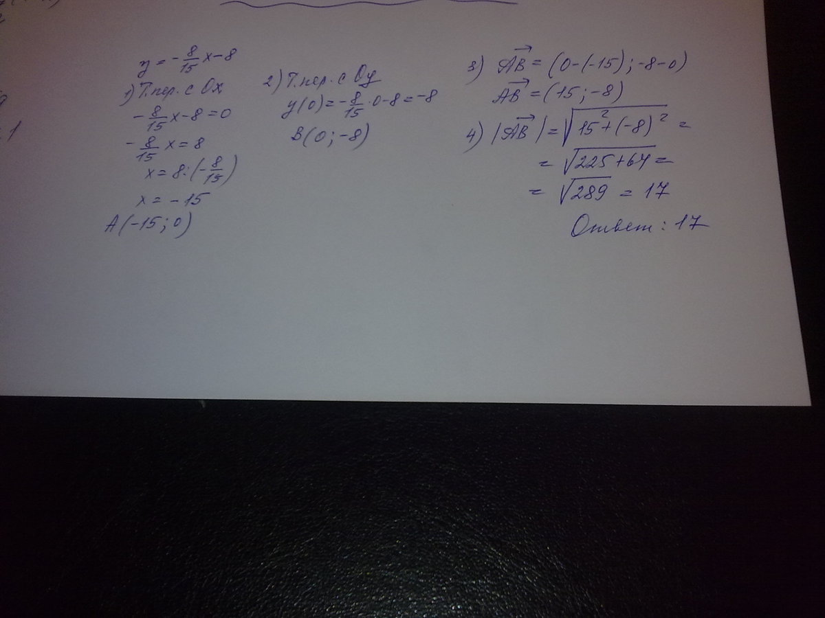 Пусть А и В- точки пересечения графика функции у=-8/15х-8 с осями координат. Найдите длину отрезка АВ.