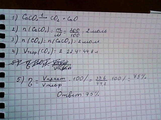 Из 200 г. карбоната кальция получено 33,6 л. углекислого газа.Каков практический выход продукта реакции?-75%