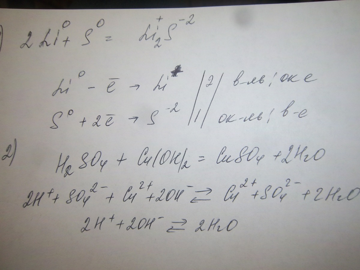 Составить уравнени реакции взаимодействия 1. серы с литием ( указать степени окисления, поставить коэффициенты с помощью эллектронного баланса) 2. раствор серной кислоты с цинком 3. раствор серной кислоты с гидрооксидом меди (2)( в молекулярной и ионной формах)