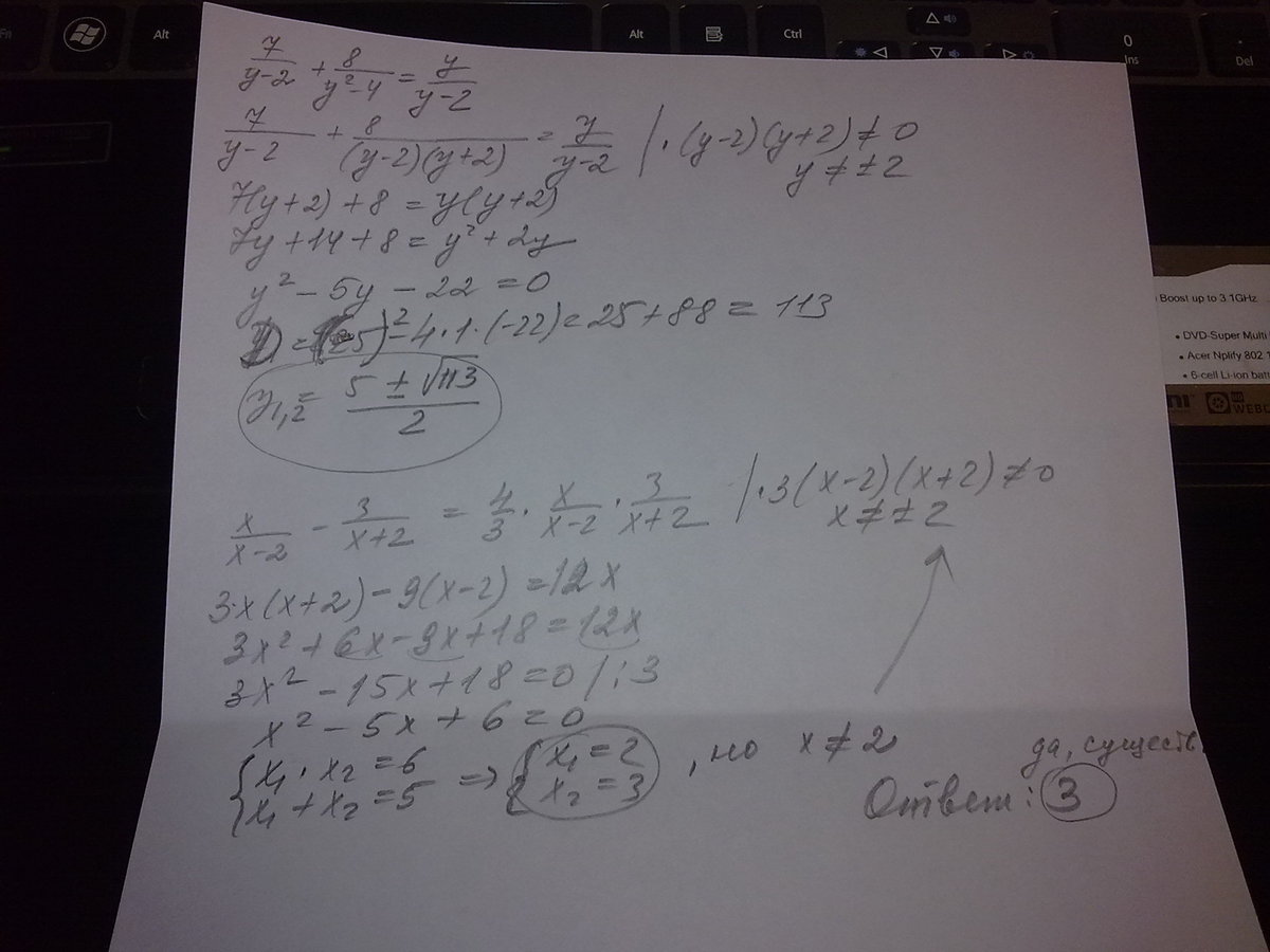 Найдите значение переменной y при которых сумма дробей 7/y-2 и 8/y^2-4 равна y/y-2