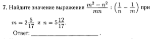 Ко второму выражению нашли доп.множители и общий знаменатель.Для первой дроби доп.множитель - m,а для второй -n.Общий знаменатель mn. Получаем в числителе второго выражения m-n, а в знаменателе mn.