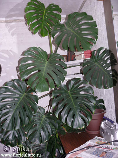 Монстера. Тропическое растение. Листья у этого вида растения большие и широкие. Такая форма листьев позволяет испарять воду из организма как можно быстрее, т.к. в тропических лесах жаркий и влажный климат.