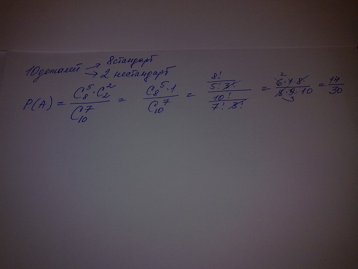 ) В партии из 10 деталей имеется 8 стандартных. Найдите вероятность того, что среди 7 взятых наугад деталей ровно 5 стандартных.
