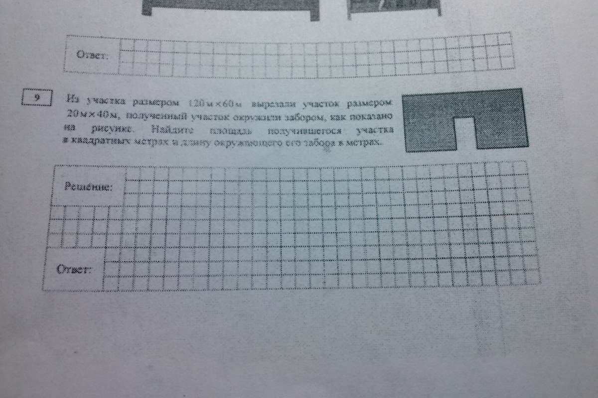 из участка размером 120м на 60м вырезали 20м на 40м, полученный участок окружили забором .НАЙДИТЕ ПЛОЩАДЬ ПОЛУЧИВШЕГОСЯ УЧАСТКА В КВАДРАТНЫХ МЕТРАХ И ДЛИНУ ОКРУЖАЕЩЕГО ЕГО ЗАБОРА В МЕТРАХ.