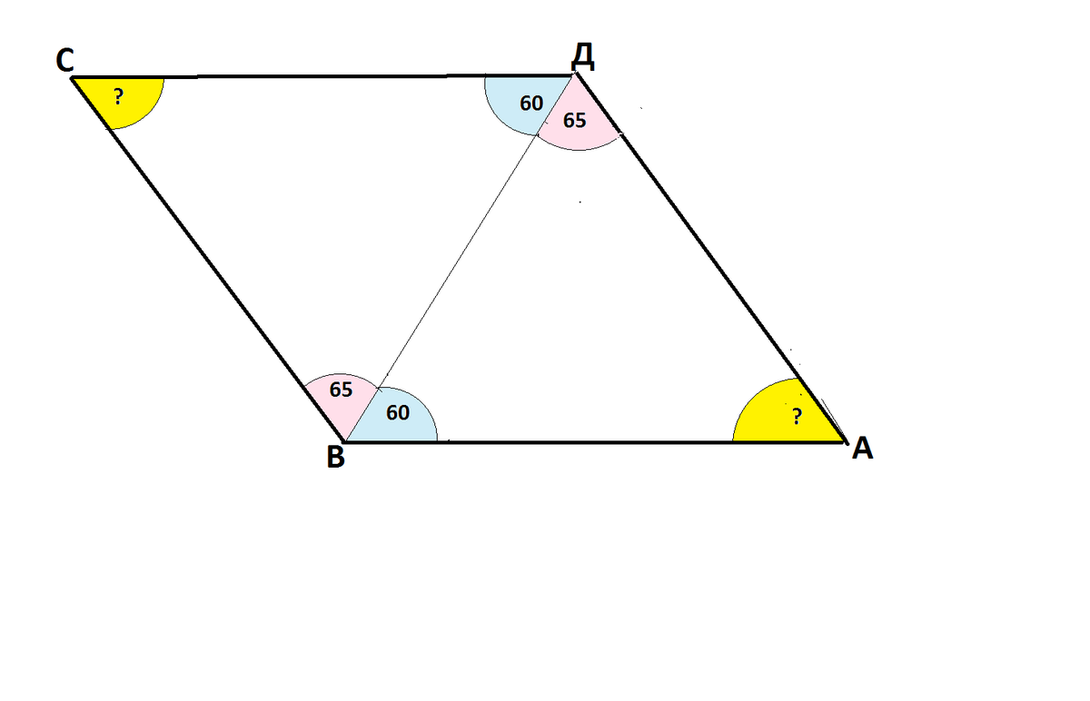 Диагональ ВД образует со стороной ВС угол 65°, со стороной ВА - угол 60°. Тупой угол параллелограмма равен сумме этих углов: