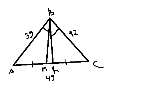 В треугольнике АВС АВ = 39, ВС = 42, СА = 45. Найдите площадь треугольника, образованного стороной АС, биссектрисой ВК и медианной ВМ.
