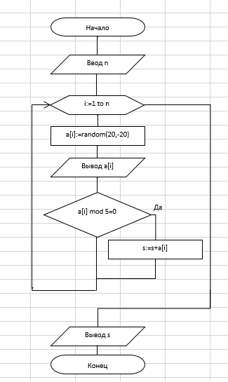дан целочисленный массив из n элементов A(n) в пределах от -20 до 20.Найти сумму тех чисел,которые кратны 5