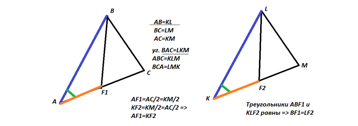 Проведем медианы BF1 и LF2, к равным сторонам AC и KM соответственно.