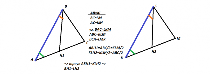 Следовательно, треугольники ABH1 и KLH2 равны по стороне и двум прилежащим к ней углам (равные эл-ты выделены цветами на рис.1), след-но, все их элементы равны, в том числе, BH1=LH2.