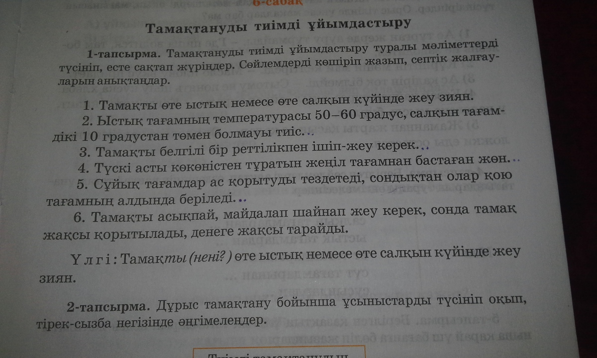 вот тебе надо прочитать и списать м предложение полностью списываешь но только после слова тамакты(нени?)дальше второе предложение тоже списываешь но только после слова тагамнын(ненин?) дальше третье предложение после тамакты (нени?)дальше 4 туски асты(нени?)коконистен(неден?)дальше 5 тагамнын(ненин?)и 6 тамакты (нени?)тамак(не?)просто списываешь все предложения и то что я в спобках написала их тоже пишешь и все)))