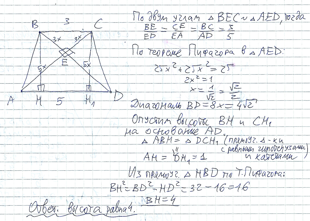 Высота равна 4. Решение в файле. Будут вопросы, спрашивайте ))