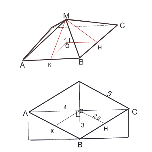 основанием пирамиды является ромб с диагоналями 6 и 8 см,высота пирамиды,проведена в точку пересечения диагоналей и равна 1 см,найти площадь боковой поверхности пирамиды