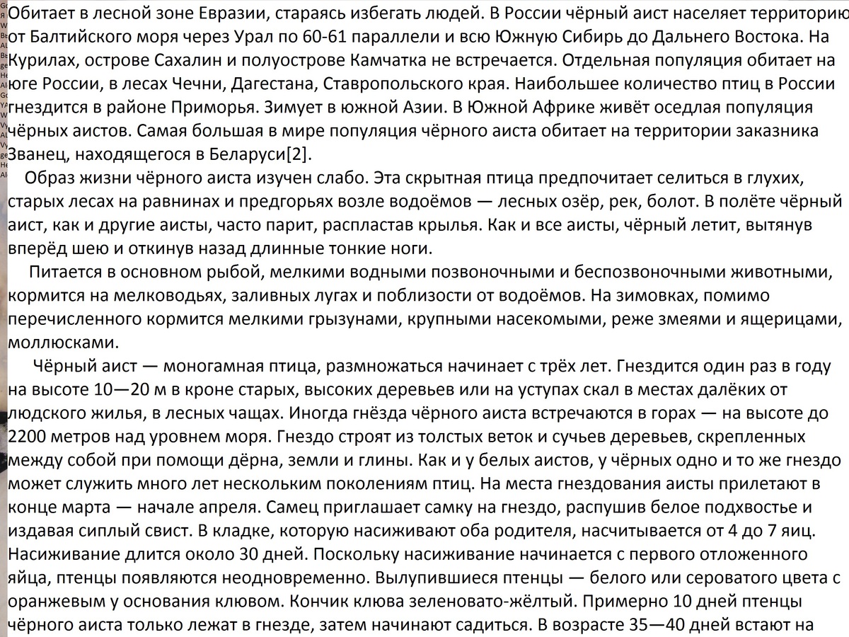 Обитает в лесной зоне Евразии, стараясь избегать людей. В России чёрный аист населяет территорию от Балтийского моря через Урал по 60-61 параллели и всю Южную Сибирь до Дальнего Востока. На Курилах, острове Сахалин и полуострове Камчатка не встречается. Отдельная популяция обитает на юге России, в лесах Чечни, Дагестана, Ставропольского края. Наибольшее количество птиц в России гнездится в районе Приморья. Зимует в южной Азии. В Южной Африке живёт оседлая популяция чёрных аистов. Самая большая в мире популяция чёрного аиста обитает на территории заказника Званец, находящегося в Беларуси.