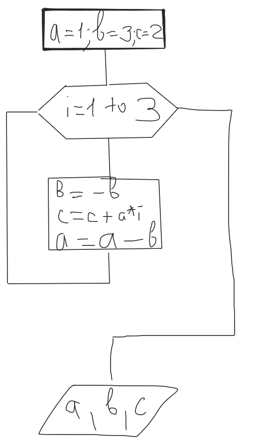 Нарисовать блок-схему, и определить какие значения примут переменные "a", "b" и "c" в результате выполнения данного фрагмента алгоритма с начальными значениями a = 1, b = 3, c = 2.