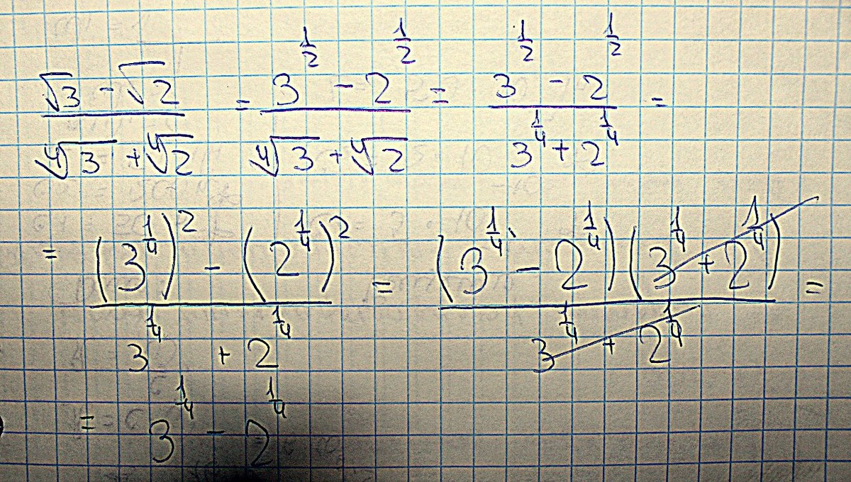 Упростите выражение: (Корень из 3 минус Корень из 2) поделить на Корень 4 степени из 3 плюс Корень 4 степени из 2.