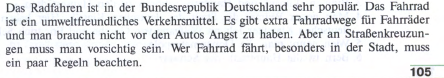 Езда на велосипеде в ФРГ очень популярна.Велосипед является экологически чистым транспортным средством.Существуют специальные велосипедные дорожки для велосипедистов, поэтому можно не бояться автомобилей.Но на уличных перекрёстках необходимо быть осторожным.Тот,кто ездит на велосипеде,особенно в городе,должен учесть несколько правил.