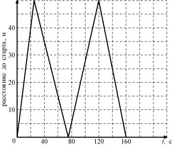 На тренировке в 50-метровом бассейне пловец проплыл 200-метровую дистанцию. На рисунке изображён график зависимости расстояния между пловцом и точкой старта от времени движения пловца. Определите по графику, за какое время пловец преодолел 110 метров