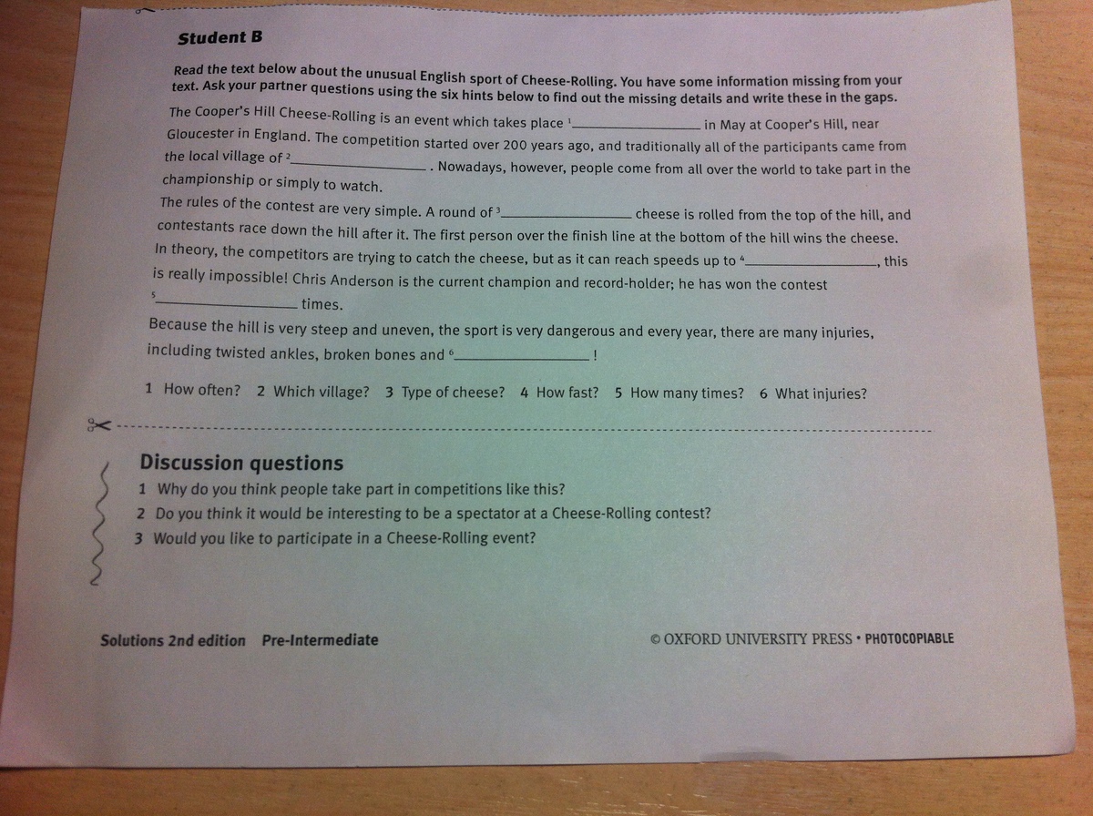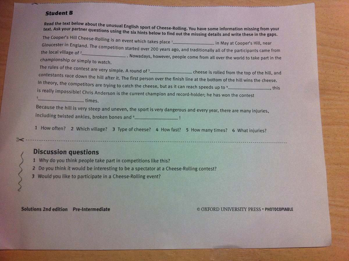 "Прочитай текст ниже про необычный английский спорт Чиз Роллинг. Кое-какой информации не достает в вашем тексте. Задай вопросы своему партнеру, используя 6 вопросов ниже, чтобы найти недостающую информацию в тексте. "