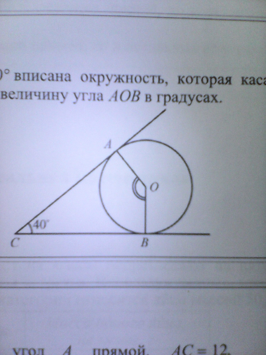 в угол С величиной 40° вписана окружность, которая касается сторон угла в точках А и В. найдите величину угла АОВ в градусах.