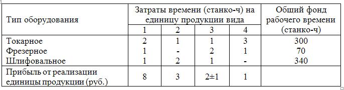 Предприятие выпускает четыре вида продукции и использует три типа основного оборудования: токарное, фрезерное и шлифовальное. Затраты времени на изготовление единицы продукции для каждого из типов оборудования приведены в таблице. В ней же указаны общий фонд рабочего времени каждого из типов оборудования, а также прибыль от реализации одного изделия данного вида. Определить такой объем выпуска каждого из изделий, при котором общая прибыль от их реализации является максимальной. Что произойдет с общей прибылью, если прибыль от продажи продукции вида 4 вырастет втрое? Как изменится общая прибыль, если предприятию будет необходимо выпускать не меньше 1 единиц продукции 3? Если увеличить время использования фрезерных станков на 80 станко-часов, то можно ли будет уменьшить время использования других станков?