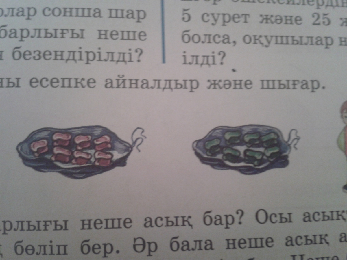 Суретте барлыгы неше асык бар? Осы асыктарды еки балага тен болип бер. Ар бала неше асык алды? Сол асыктарды балаларга 2-ден болип бер. Неше бала асык алды?