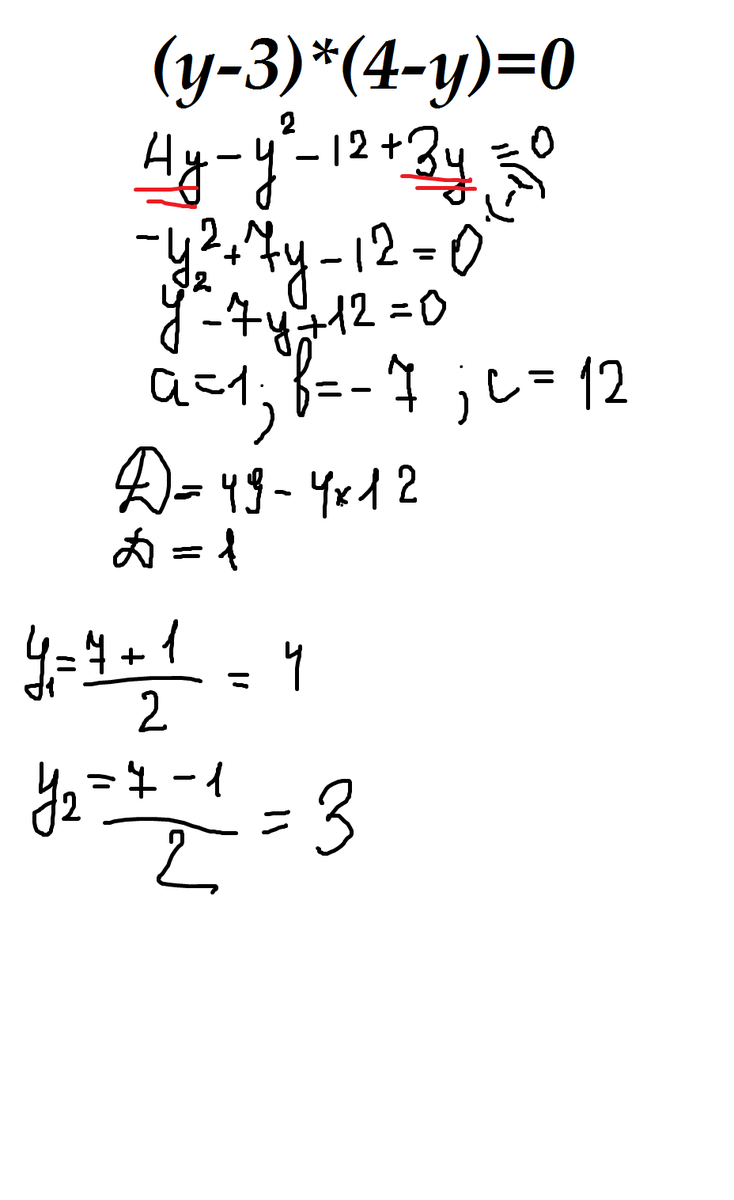 уравнение ( y - 3) * ( 4 - y ) = 0 . Решите пожалуйста, я знаю , что игрек это - 4 , а записать решение не могу(