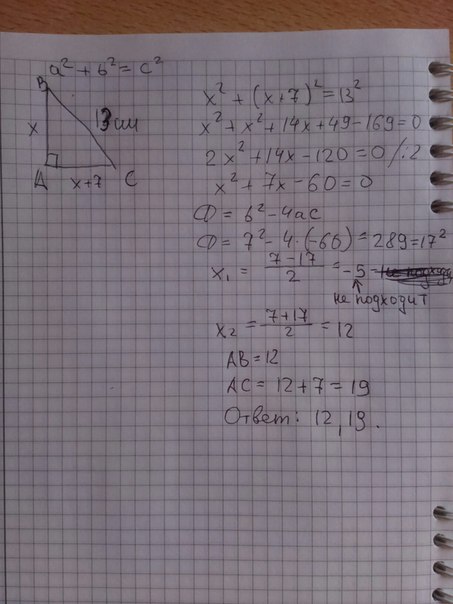 гипотеза треугольного треугольника равна 13см. Найдите его катеты, если известно, что один из них на 7см больше другого