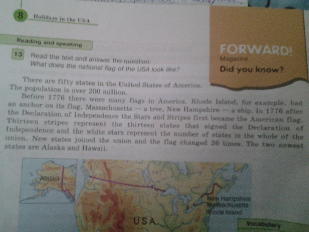В Америке 50 штатов. Их население более двухсот миллионов. Пред 1776 у А Америки было много флагов. У острова Род к примеру, на флаге были ???,у Массачусетса-дерево, у Нового Хэмпшира-корабль. В 1776,после подписания декорации независимости линии и звезды появились на флаге Америки. 13 полос обозначают 13 штатов,подписавших декл. независ.,а белые звезды-все 50 штатов Новые штаты входили в союз и флаг Америки меняли 26 раз. Два новейших штата- Аляска и Гаваи