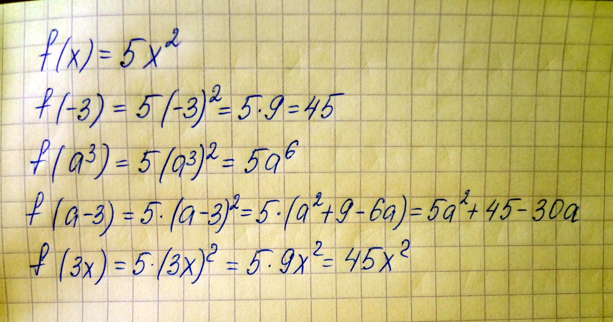 Дана функция y=f(x), где f(x)=5x^2. Найдите f(-3); f(a^3); f(a-3); f(3x).