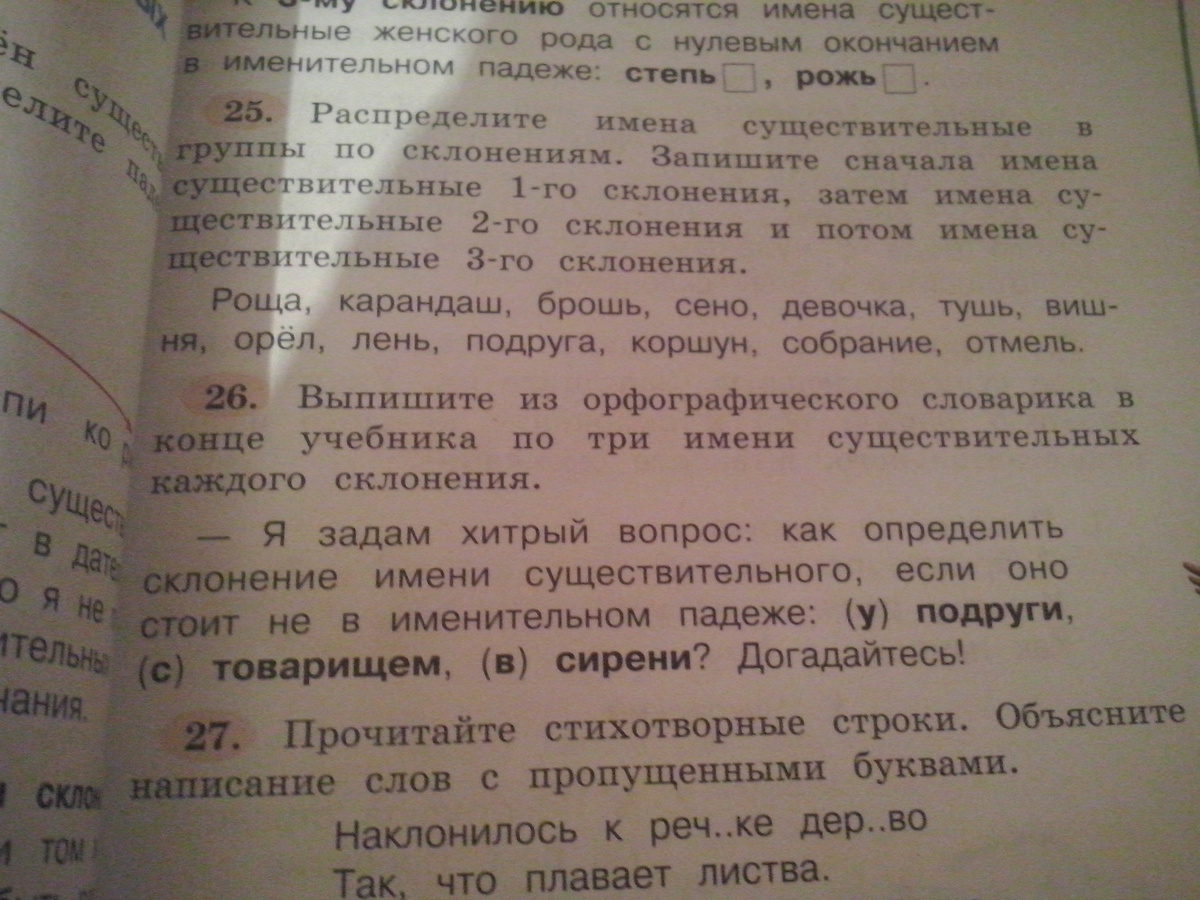 А затем нужно написать по три слова каждого склонения.Для этого ты должен использовать орфографический словарь.В этом словаре рядом с каждым существительным написано к какому склонению оно относится.Всё!