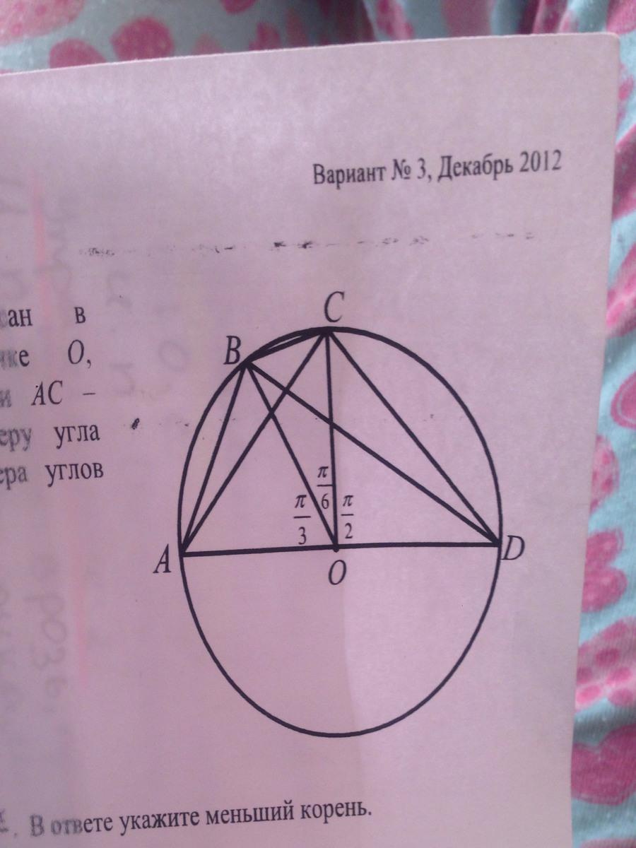 Четырехугольник ABCD вписан в окружность с центром в точке O,принадлежащей стороне AD,BD и AC-диагонали.Найдите градусную меру угла ABD,если извесна радианная мера углов AOB,BOC,COD.