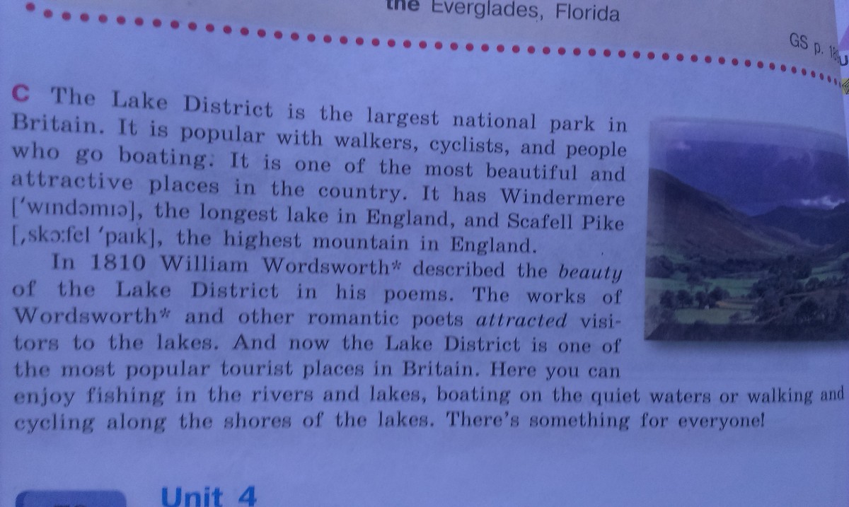 Озерный край самый большой найциональный парк Великобритании. Он знаменит пешеходами, велосипедистами и людьми, кто занимается лодочным спортом(плывут на лодках).Это одно из самых красивых и привлекательных мест в стране. В этом парке находится самая длинная река в Англии Виндермер и самая высокая гора Англии- Скейфел-Пайк.