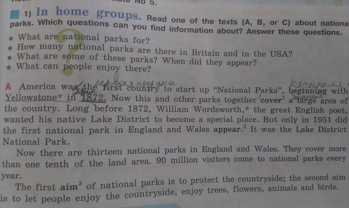 1) National parks are for protecting the countryside and letting people enjoy the countryside and nature(trees,folwers,animals,birds)