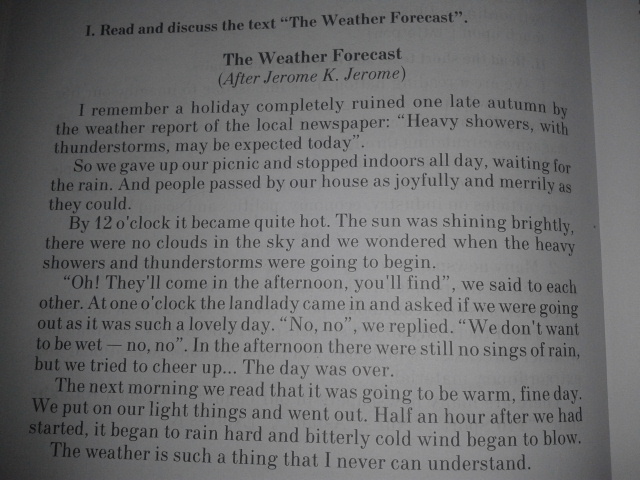 Следующим утром мы прочитали, что день обещает быть хорошим и теплым. мы легко оделись и вышли из дома. Через полчаса после того, как мы вышли, начался сильный дождь и подул очень холодный ветер.