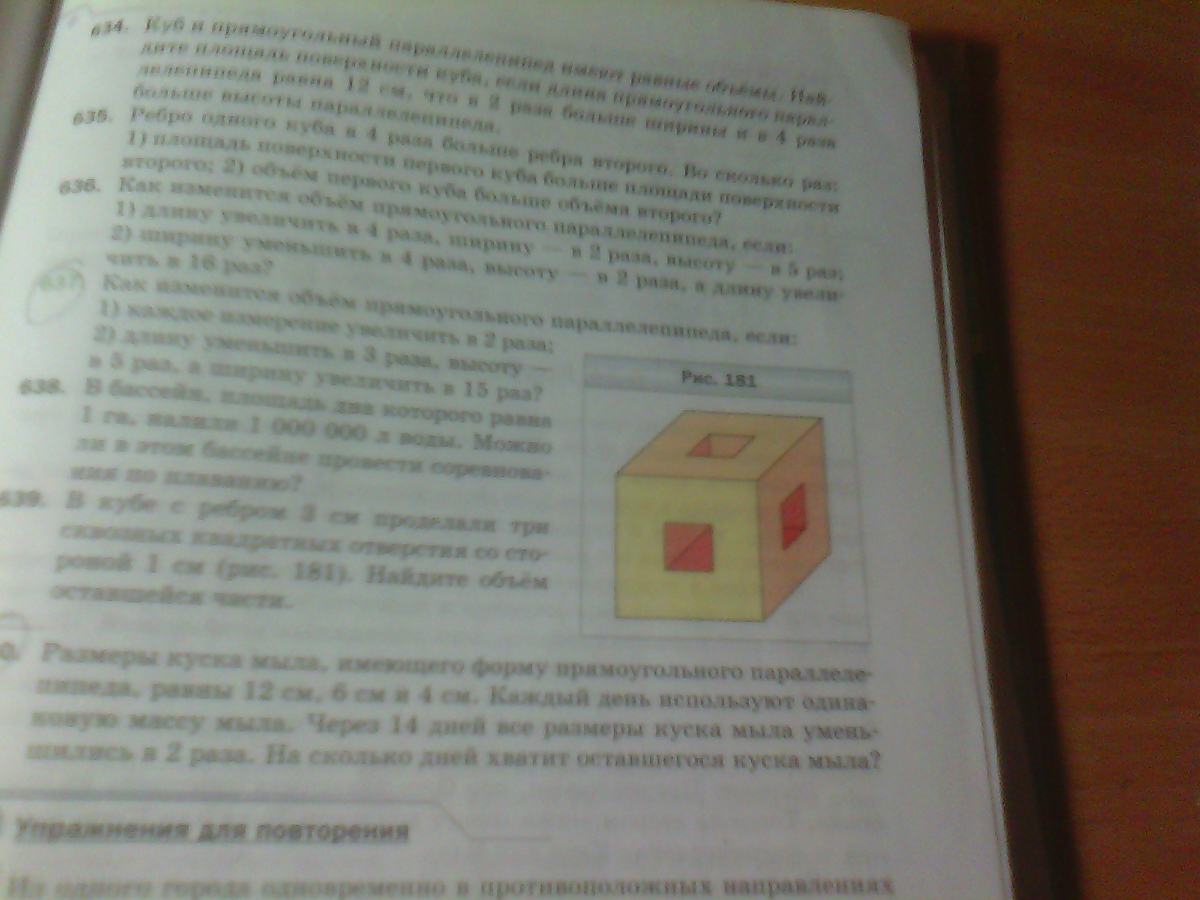 В кубе с ребром 3 см проделали три сквозных квадратных отверстия со стороной 1 см рисунок 181 найдите объем оставшейся части