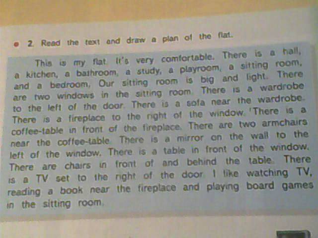 Это моя квартира,она очень удобная .Тут есть холл,кухня,ванная,студия,комната для учебы,игровая комната,гостиная,и спальня .Наша гостиная большая и светлая.В гостиной есть два окна.Левее от двери есть гардероб.Диван рядом с гардеробом.Правее от окна есть камин.Напротив камина стоит кофе-столик.Также там есть два кресла возле кофе-столика.Зеркало на стене левее окна.Напротив окна есть стол.Еще есть стулья напротив и сзади стола.Там телевизор правее двери.Мне нравится смотреть телевидение,читать книгу возле камина и играть в настольные игры в гостиной.