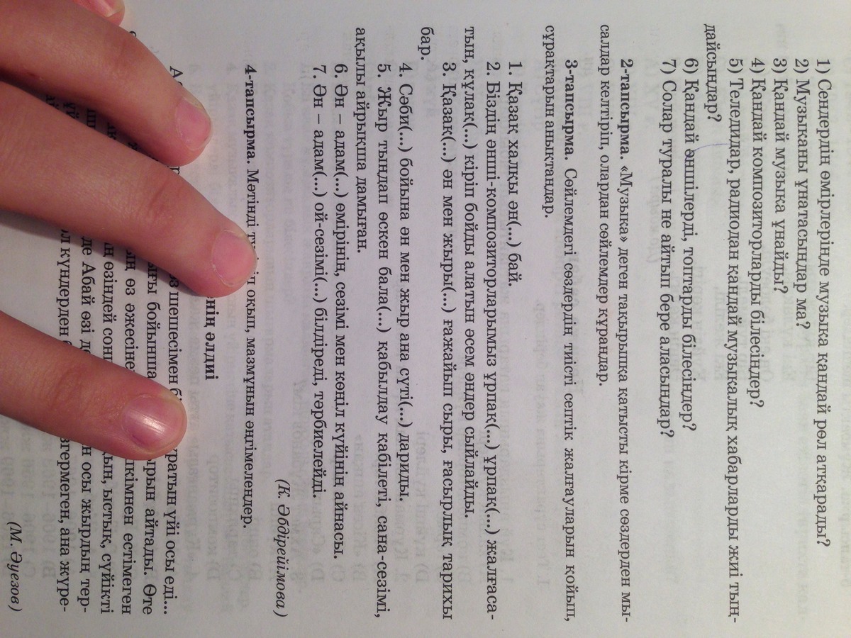 Жыр тыңдап өскен баланың (кімнің?) қабылдау қабілеті, сана-сезімі, ақылы айрықша дамыған. Ән - адамның (кімнің?) өмірінің, сезімі мен көңіл күйінің айнасы. Ән адамның (кімнің?) ой сезімін (нені?) білдіреді, тәрбиелейді.