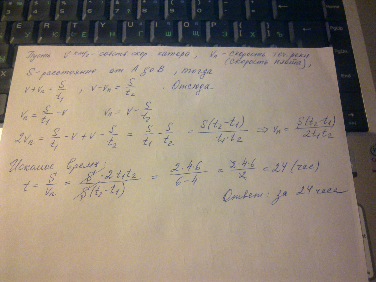 Расстояние от пункта А до пункт В по течению реки катер проплывает за 4 часа, а обратно за 6 часов. За сколько часов плот преодолеет это расстояние?