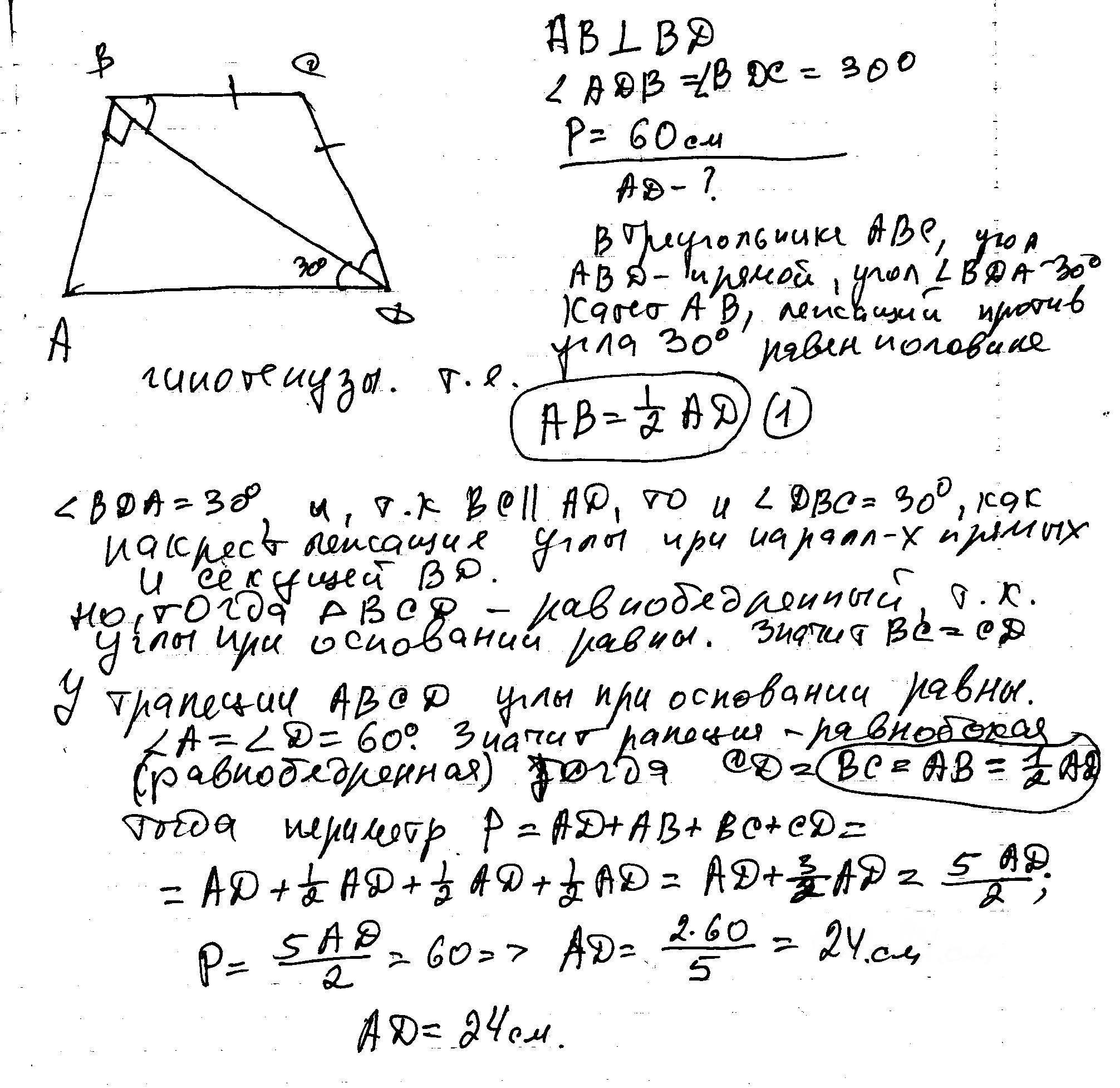 в трапеции ABCD диагональ BD перпендикулярна боковой стороне AB ,угол АВD=углу BDC=30.Найдите длину AD,если периметр трапеции 60 см