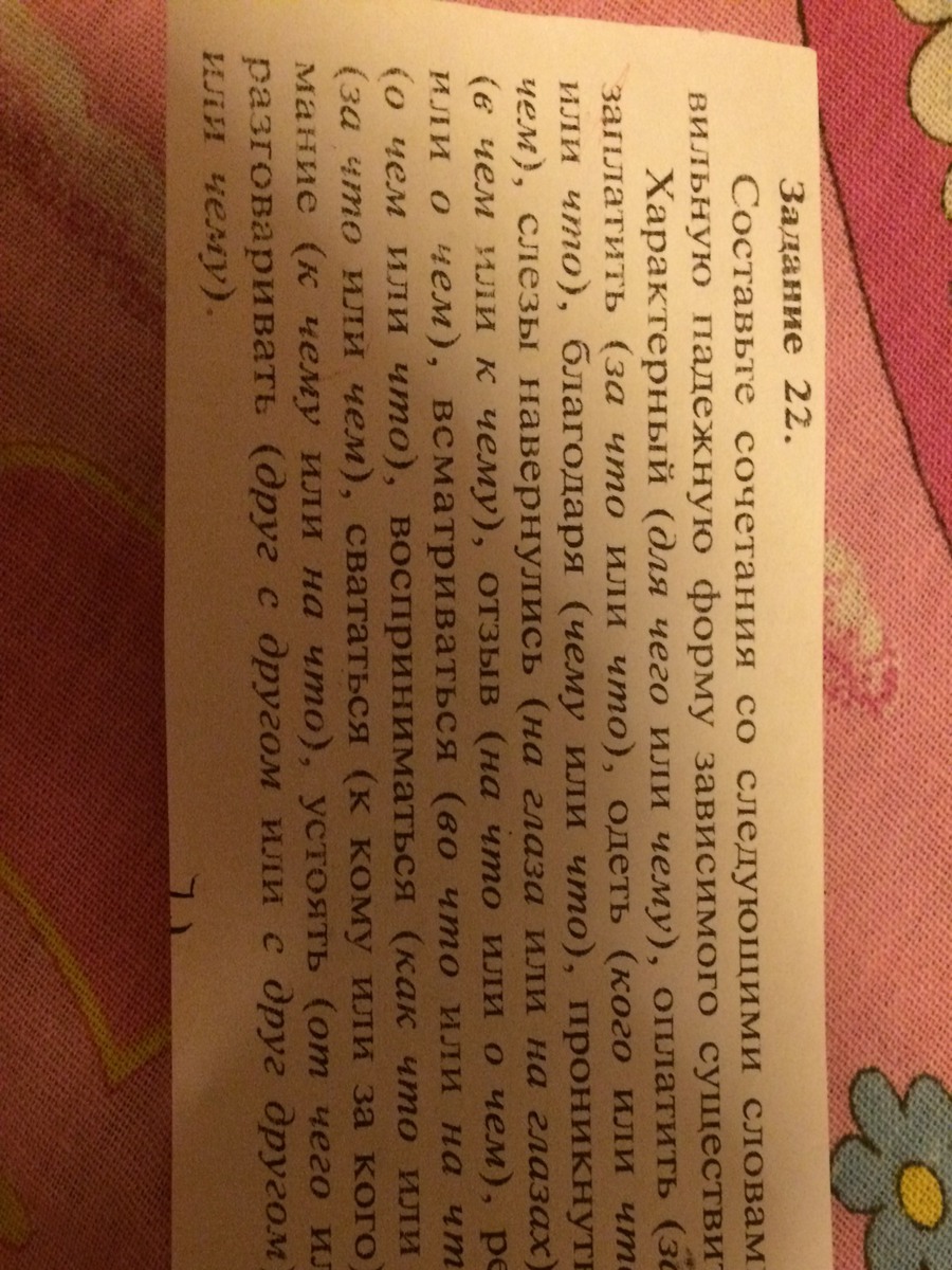 1. Характерный для чего. 2. Оплатить что. 3. Заплатить за что. 4. Одеть кого. 5. Надеть что. 6. Благодаря чему. 7. Проникнуться чем. 8. Слезы навернулись на глаза. 9. Напутствовать в чем. 10. Отзыв о чем. 11. Рецензия на что. 12. Всматриваться во что. 13. Предвещать что. 14. Восприниматься как что. 15. Гордиться чем. 16. Свататься к кому. 17. Обратить внимание на что. 18. Устоять против чего. 19. Разговаривать друг с другом. 20. Вопреки чему.