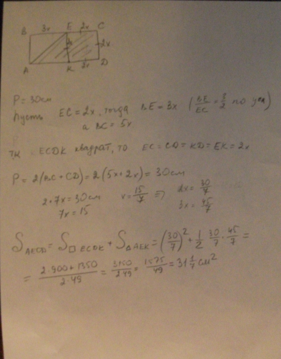 Периметр прямоугольника ABCD равен 30 см, где BE : EC=3:2; ECDK - квадрат. Вычислите площадь фигуры AECD